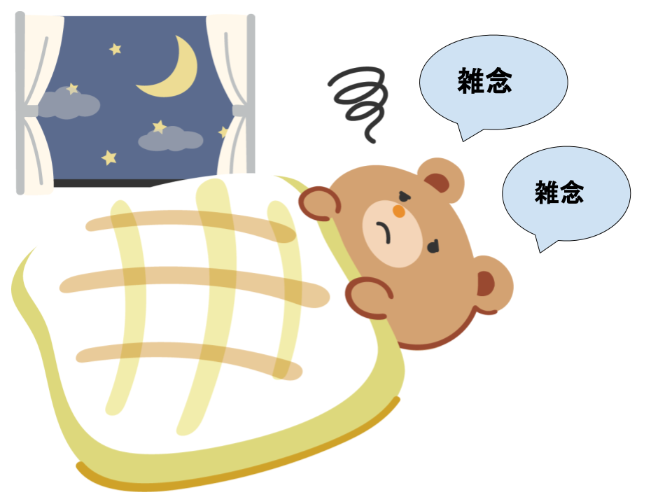 寝つきを妨げるもっとも大きな要因は、床に就いた後に、さまざまな「雑念」が浮かぶことです。それにより神経がたかぶり、緊張することで、なかなか寝つけなくります。